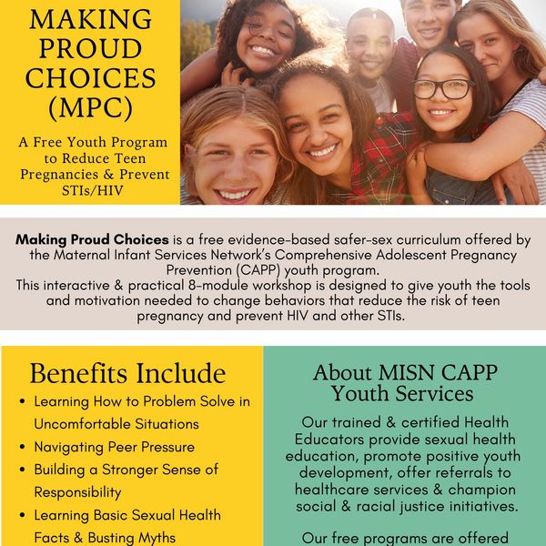 The Maternal Infant Services Network’s (MISN) Comprehensive Adolescent Pregnancy Prevention (CAPP) Youth Program provides tools and resources that enables positive youth development, healthy relationships with family and peers, and gives them a sense of purpose to be responsible adults.